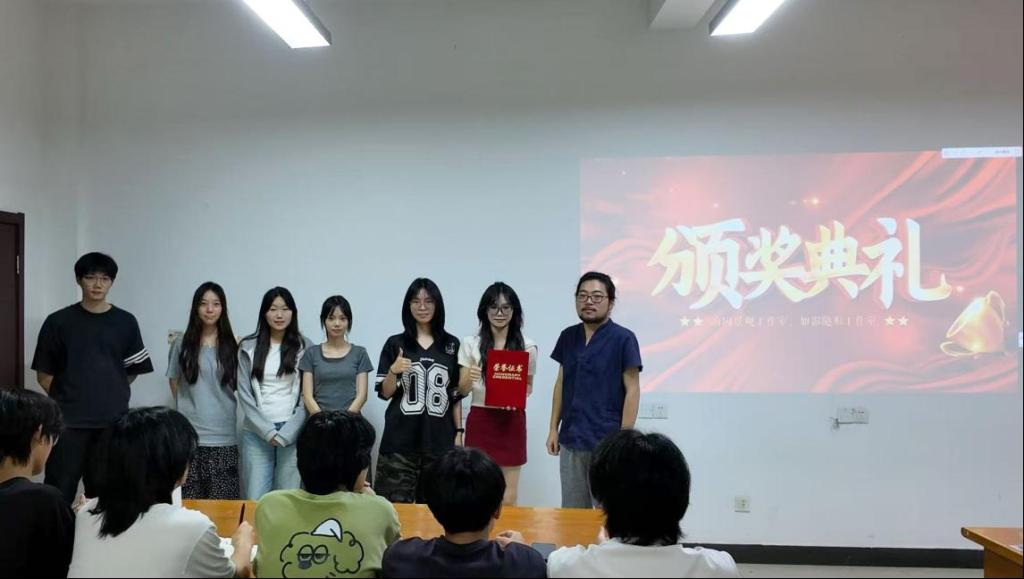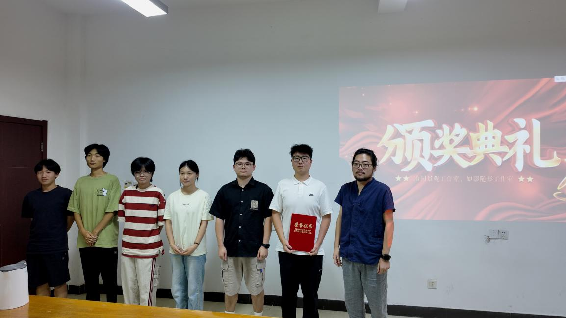 (倪鑫航为获奖团队颁发证书,与团队成员合影留念)
