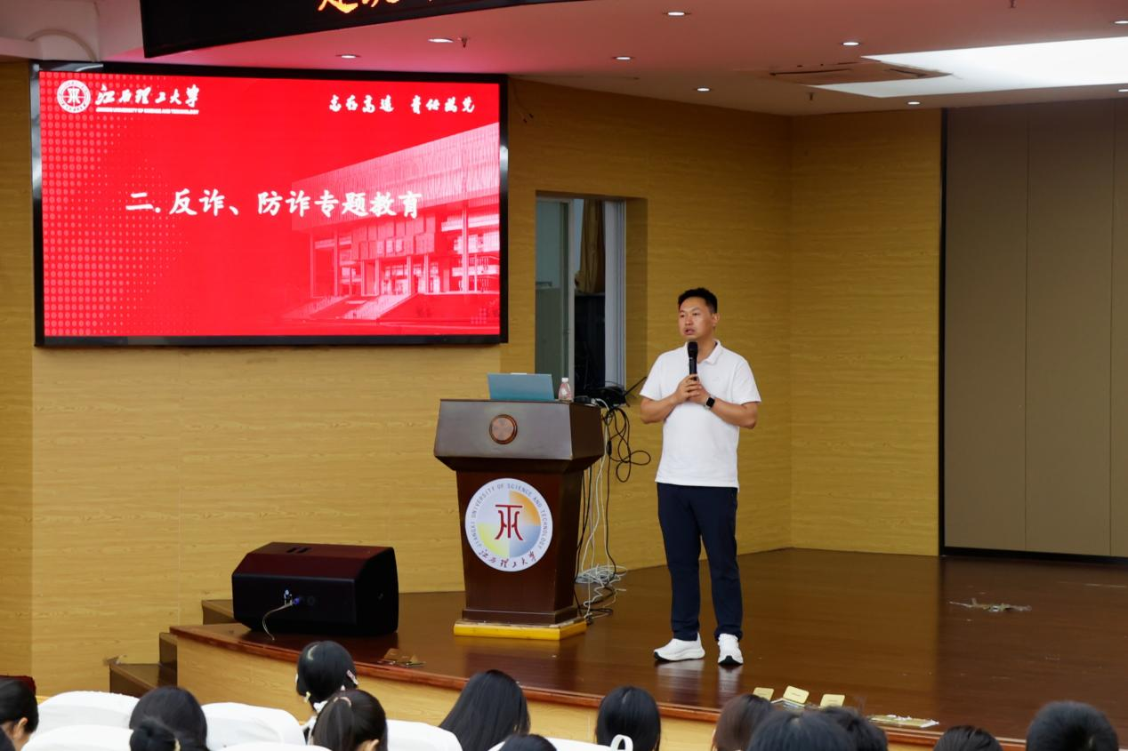 会上,宿雅威首先带领全体新生深入学习全国教育大会精神,重点解读了新时代教育改革发展的新理念、新思想、新战略。其次在“反诈、防诈专题教育”环节,他结合近年来高校发生的真实案例开展“反诈、防诈”教育,以增强新生的识别能力和防范意识,提醒同学们要保护好个人隐私信息,不轻信陌生来电,不随意点击链接,遇事多与老师、家长沟通,切实做到“不听、不信、不转账”。