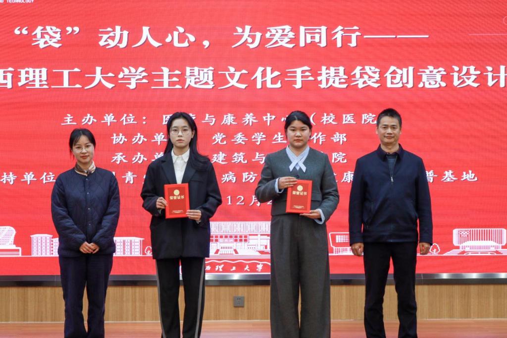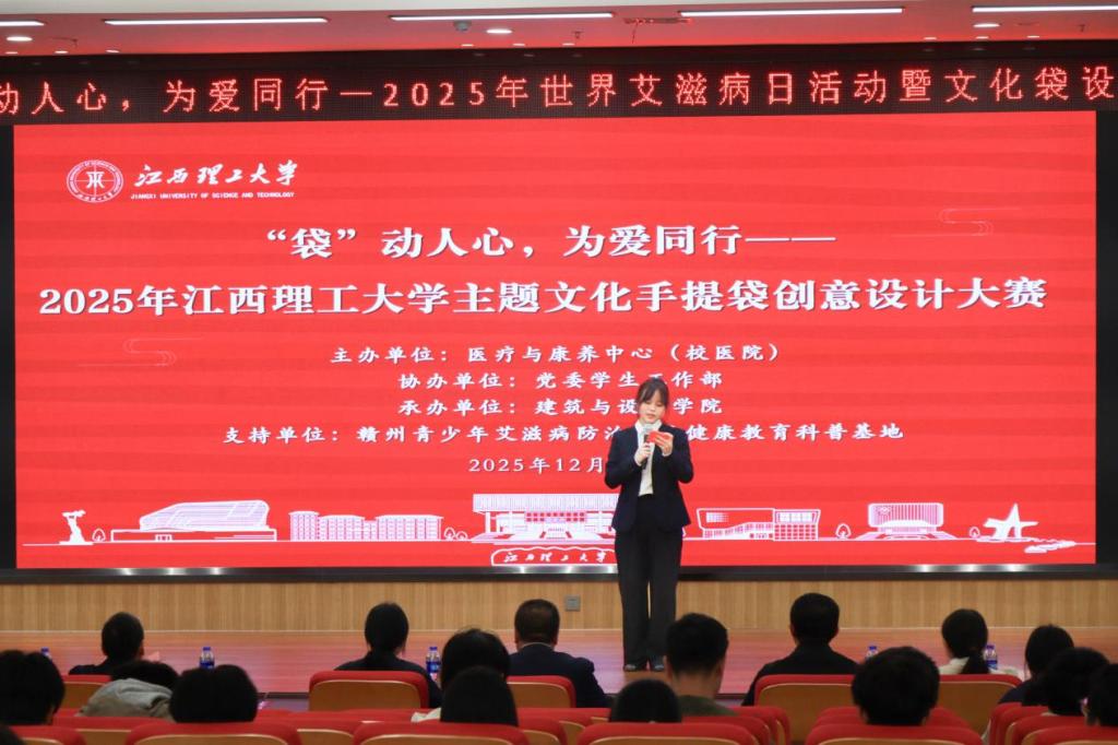 本网讯 12月2日,我院承办的“‘袋’动人心,为爱同行”——2025年江西理工大学主题文化手提袋创意设计大赛在学校图书馆举行,这也是学校2025年世界艾滋病日的一次宣传教育活动。大赛由学校医疗与康养中心(校医院)主办,学工部协办,建筑与设计学院承办,赣州市疾病预防控制中心艾防科科长杨荣荣、校医院院长周茂平、学工部副部长刘黎明、校团委副书记龙平、建筑与设计学院党委副书记刘现鹏、校医院院长助理刘段香、建筑与设计学院教师郭文瞻出席大赛,与参赛选手及学生代表共同参与此次活动。