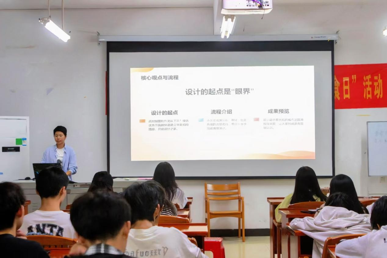 在海报设计教学环节,张欣同学以扎实的实践经验为切入点,开展针对性强、实操性突出的技能授课。她摒弃枯燥理论灌输,将PS基础操作拆解为“工具拆解—案例演练—创意落地”三步教学法,深入浅出讲解图层编辑、蒙版运用、抠图技巧等核心操作;同时结合本土特色设计案例,拆解黄金分割构图、对称式构图的应用逻辑,以及新疆民族色彩、客家传统配色的提取与搭配方法,让抽象设计原理直观易懂。教学全程贯穿“用设计讲好文化故事”的核心理念,鼓励学员以设计为媒介,让地方文化在创意创作中鲜活起来。